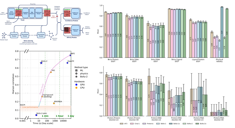 図.Boltz-2のアーキテクチャおよびベンチマーク。Passaro S, Corso G, Wohlwend J, et al. “Boltz-2: Towards Accurate and Efficient Binding Affinity Prediction” bioRxiv, 2025, doi:10.1101/2025.06.14.659707 の Figures 1–3 をマージ・再構成。CC BY 4.0 ライセンスの下で利用。